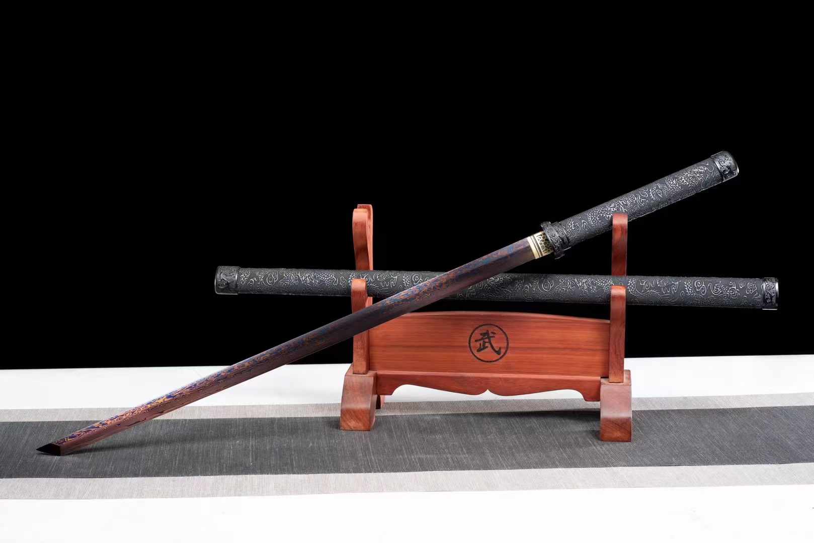 - The solid wood scabbard, wrapped in a dragon-patterned PU leather, and the wood handle coated in the same material, provide a durable and visually striking complement to the blade.