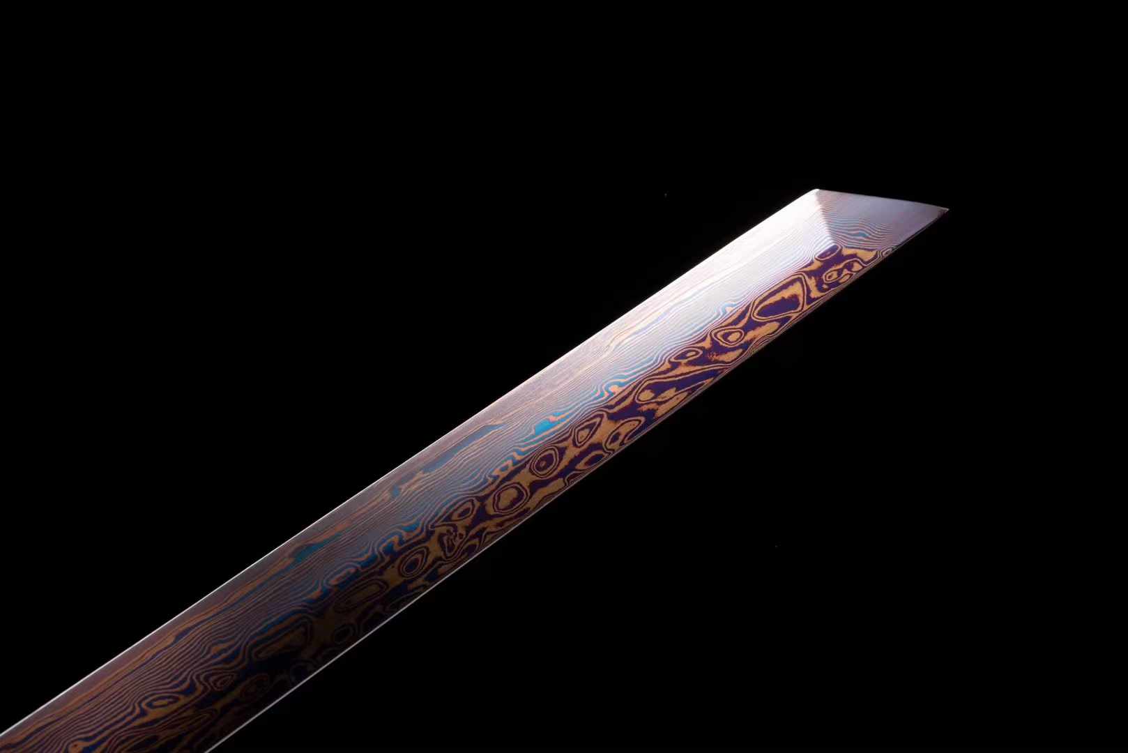 - This expertly crafted sword, named "Plunder", features a blade forged from Damascus steel and treated to an exceptional 60 HRC hardness. The blued finish and intricate flower pattern give the blade a stunning visual appeal.