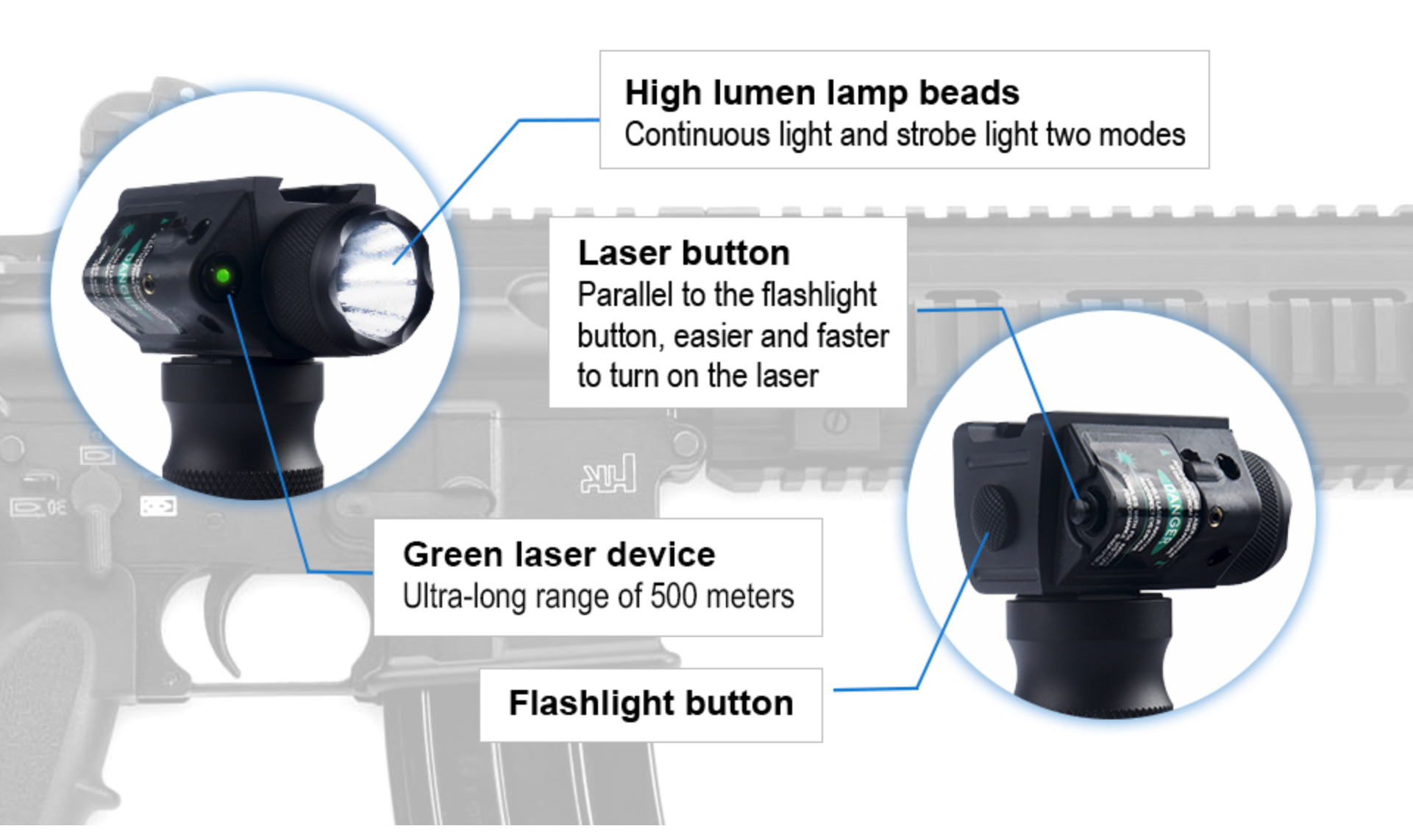 Powerful magnification makes this scope well suited for mid to long range shooting and the dot sight and laser provide quick acquisition of close quarter & fast moving targets. The vertical foregrip allows for an easier manipulation and a better hold as well as a flashlight laser.