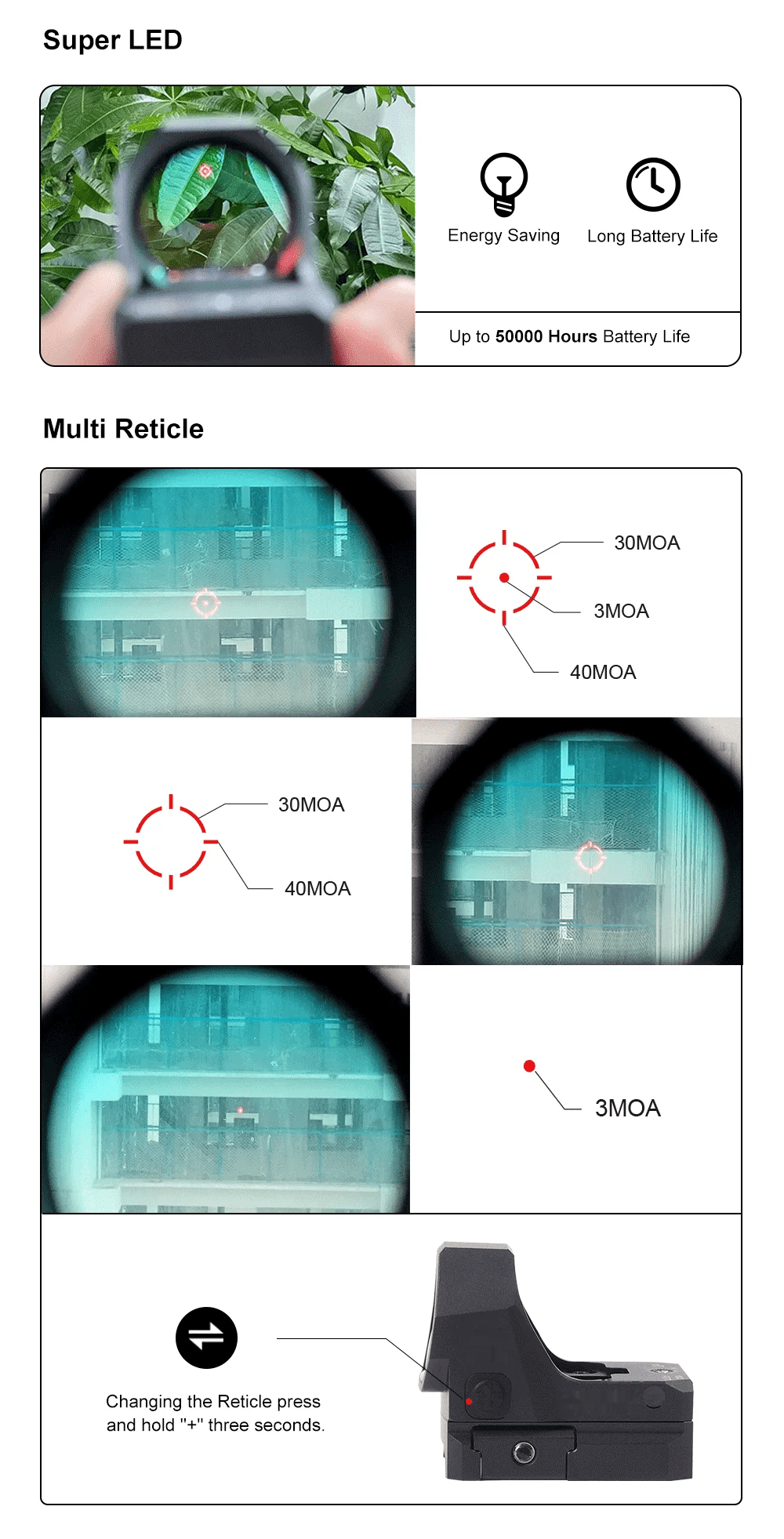 Meet the versatile powerhouse that is the Regulator MRS! This red dot not only has the original's parallax-free design, 50,000 hour runtime, Motion-Sensing Technology, but it adds multi-reticle functionality with a 3moa center dot. Worried about rain? Don’t be! The Regulator is IP67 waterproof. Will it hold up to (insert caliber)? Hell yeah it will! Rated up to 1200g’s, this little guy will eat .338 Lapua recoil for breakfast and comes with a lifetime warranty! Place it on your pistol, shotgun, or rifle and never worry about recoil issues. Add unparalleled precision and night vision adaptability to your firearms with the Regulator MRS, and choose the reticle that best fits your style. Enjoy a customized shooting experience, and get yours today!